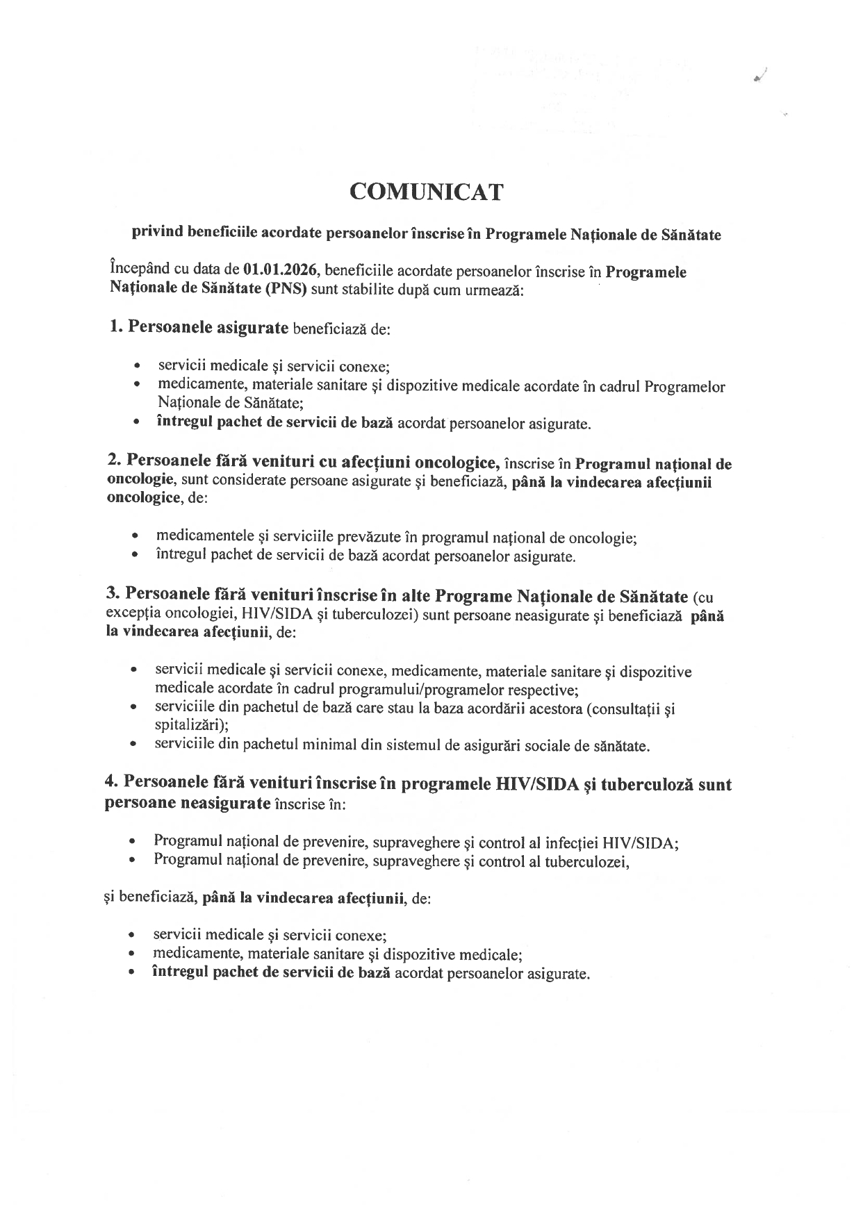Anunturi Comunicat privind beneficiile acordate persoanelor înscrise în Programele Naționale de Sănptate