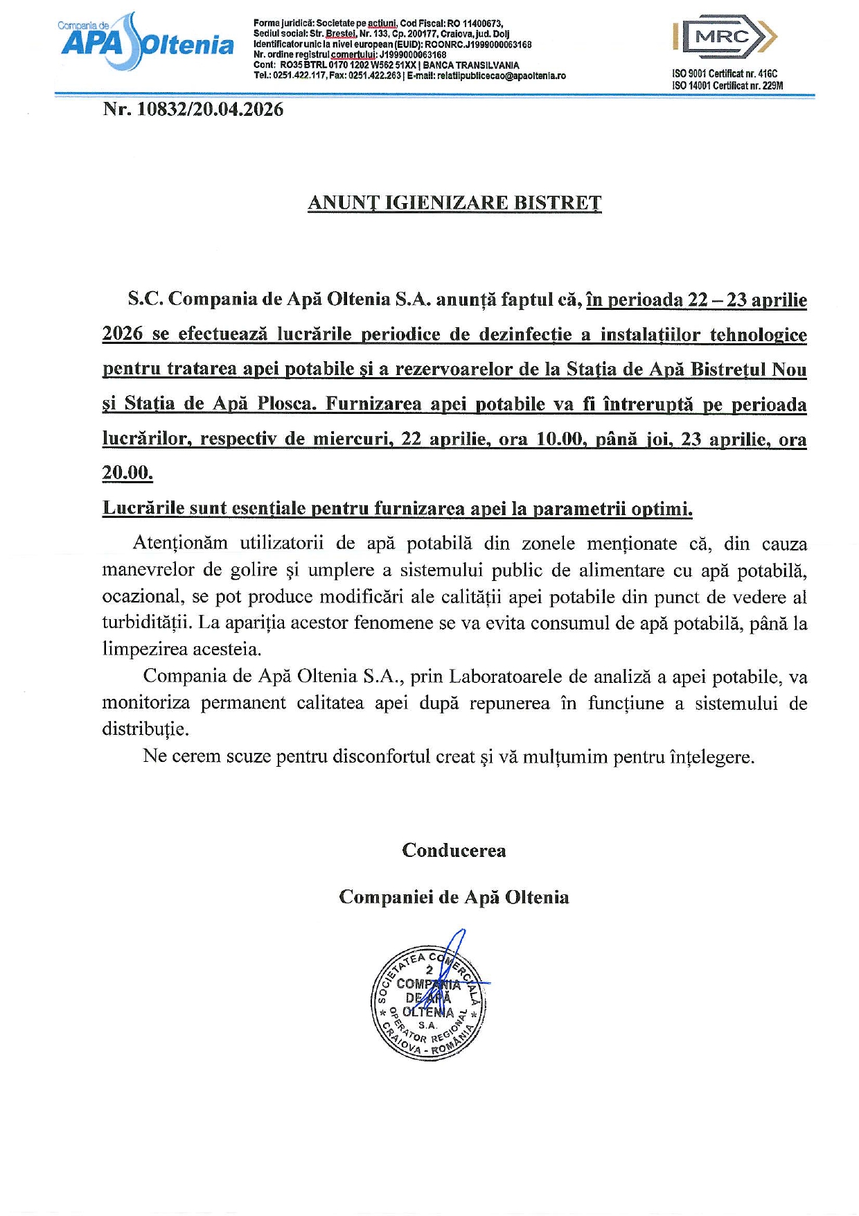 C.A.O. - ANUNȚ IGIENIZARE - 22-23.04.2026